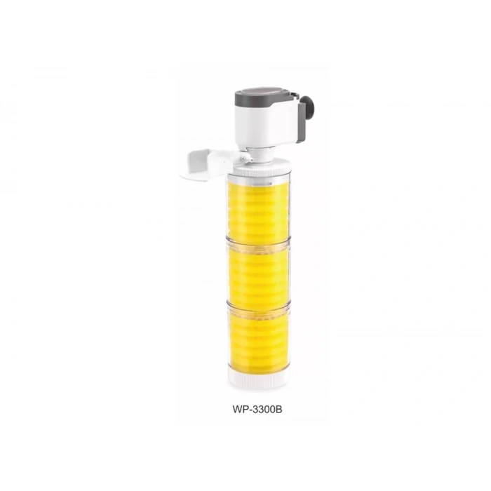 Sobo WP-3300B akvaryum iç filtre, 25W gücü ve saatte 1500 litre debisiyle 3 katmanlı güçlü filtrasyon sunar. Hava hortumu destekli, tatlı ve tuzlu su akvaryumları için ideal iç filtre.