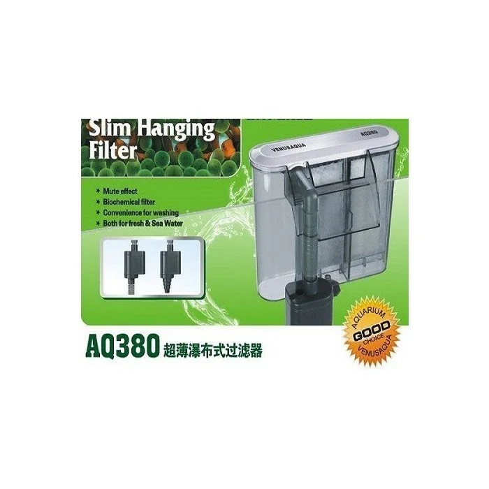 Venus Aqua AQ380F şelale filtre, 380 L/h debisi ve 3,5 W düşük enerji tüketimiyle tatlı ve tuzlu su akvaryumlarında sessiz ve etkili filtrasyon sağlar.
